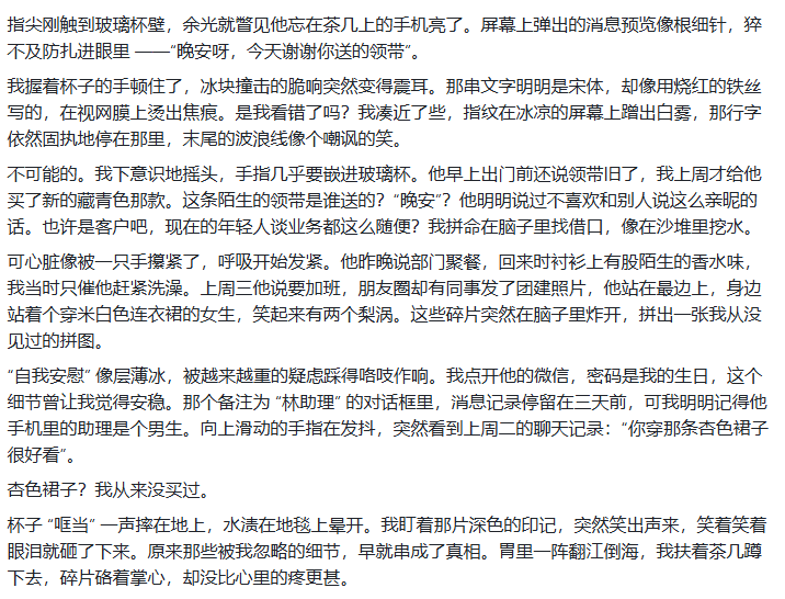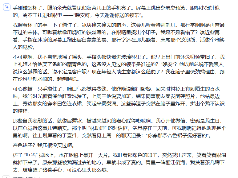 ▶ 工具2:豆包(传送门:doubao.com/chat) 它需要更具体的场景指令。上次写女主撞见男友出轨,我输入: “用第一人称描写心跳加速、指甲掐进掌心的生理反应,避免‘心痛’‘流泪’这类直白词” 生成后我调整了语序,把“胃部像被冰锥刺穿”改成“晚饭的意面在胃里结成硬块”——小说的素材要真实可感。