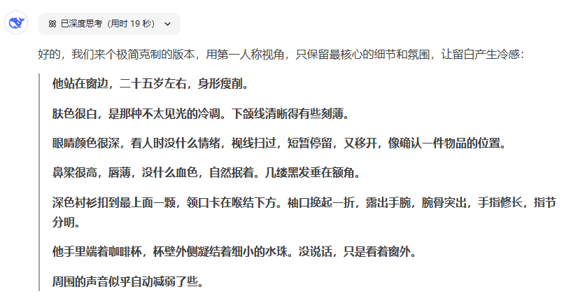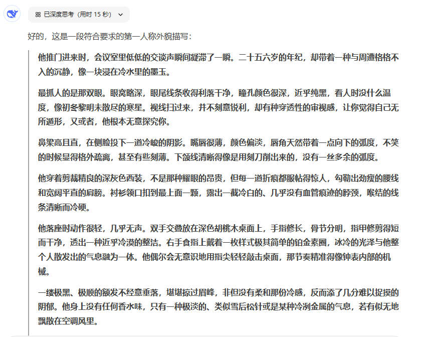 ▶ 工具1:DeepSeek(传送门:deepseek.com) 它最擅长具象化描写。比如你想刻画神秘男主,别输“描写帅哥”,试试精准指令: “生成25岁金融精英的外貌细节:镜片后的冷冽眼神,袖扣半松的商务衬衫,指尖烟蒂积了长灰却忘了弹” 生成后我会删掉冗余比喻,保留“烟灰”这种有故事感的细节。写小说技巧在于:AI给素材,你来做剪辑师。