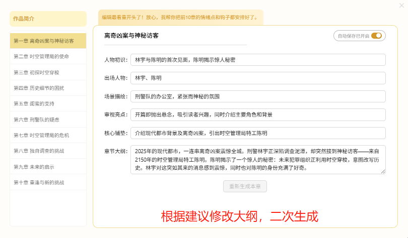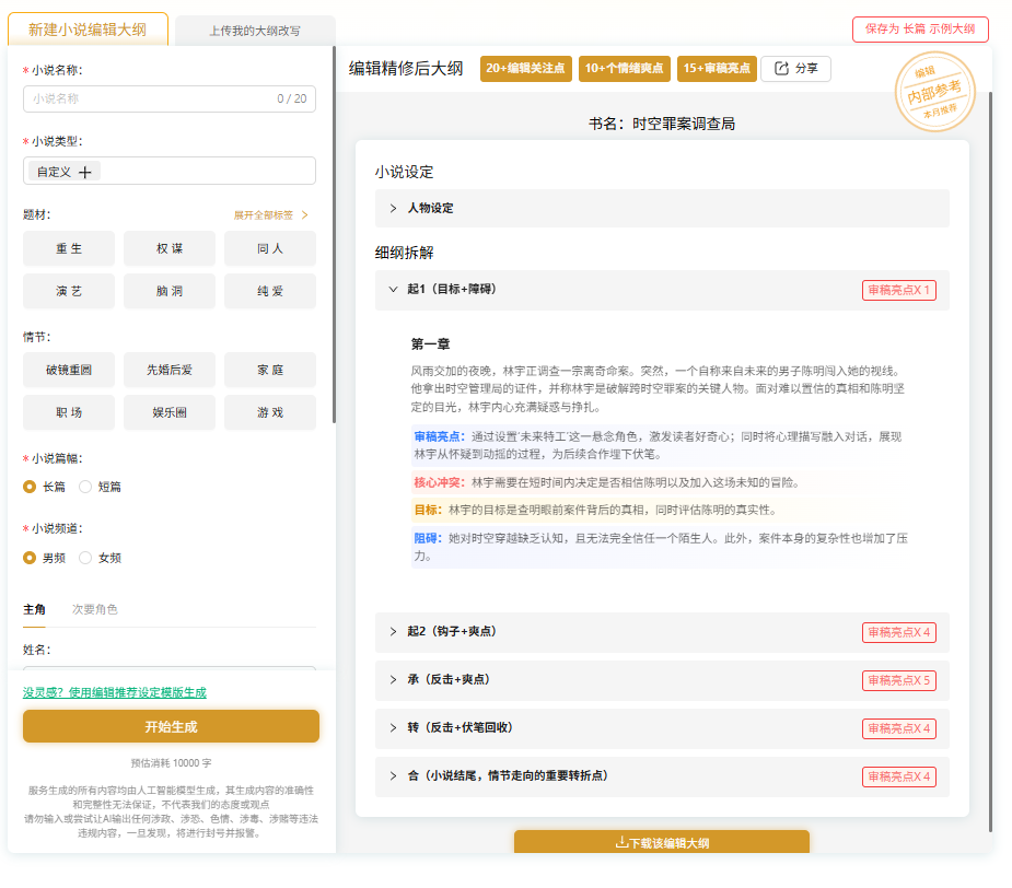 我截取“童谣线索”这个金点子,重写了情感线。更惊喜的是小说编辑大纲功能——生成的大纲直接标注了“平台签约敏感点”: “母爱与反人类决策的冲突需强化,避免价值观争议” 这份编辑视角的批注,比我自己琢磨的小说大纲模板实用十倍。