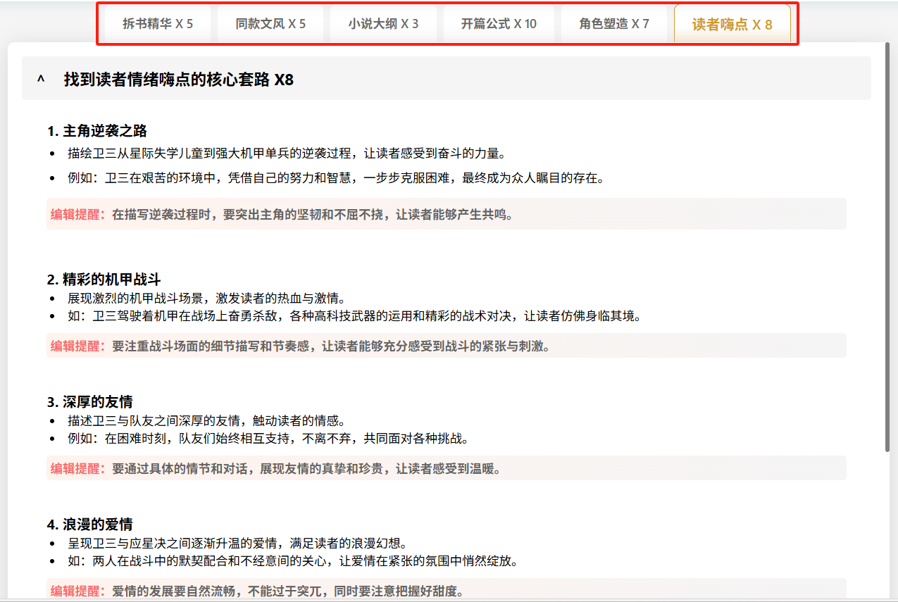 我抱着试试的心态点进去,结果……它直接给我列了一整套:人物背景、动机逻辑、剧情冲突、三段结构推进。不是那种模板套话,而是把“重生后女主利用假婚约反杀前任和情敌”这样的设定写得头头是道。哪段该放反转、高潮该怎么铺,都给我整出来了。