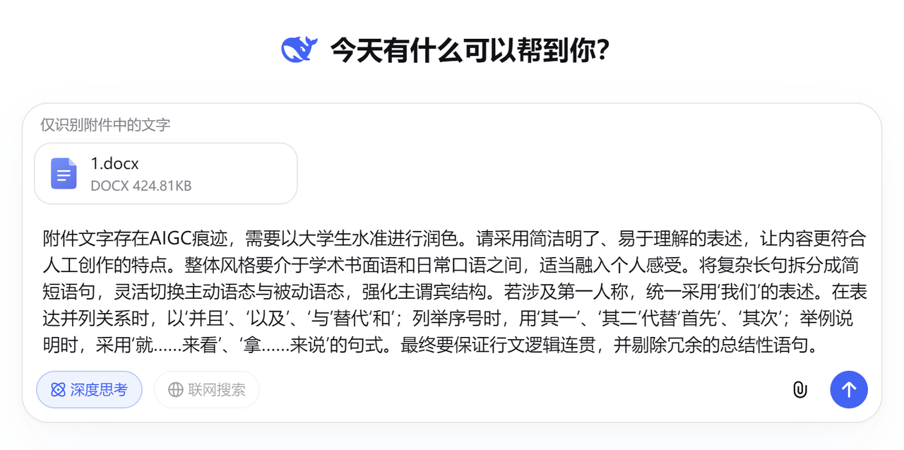 不过呢,DeepSeek要靠提示词来降AI。网上有一堆所谓“万能提示词”,但实际体验下来,效果并不稳定。举个例子,你用一套提示词,AI率可能能降一点。但换个检测平台,又不灵了。