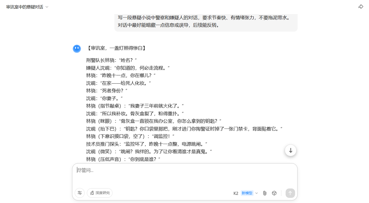 我用它写过一篇职场题材的悬疑小说,直接让它接着我的第一段往下写,它能迅速理解情境并给出合理的下一步动作。