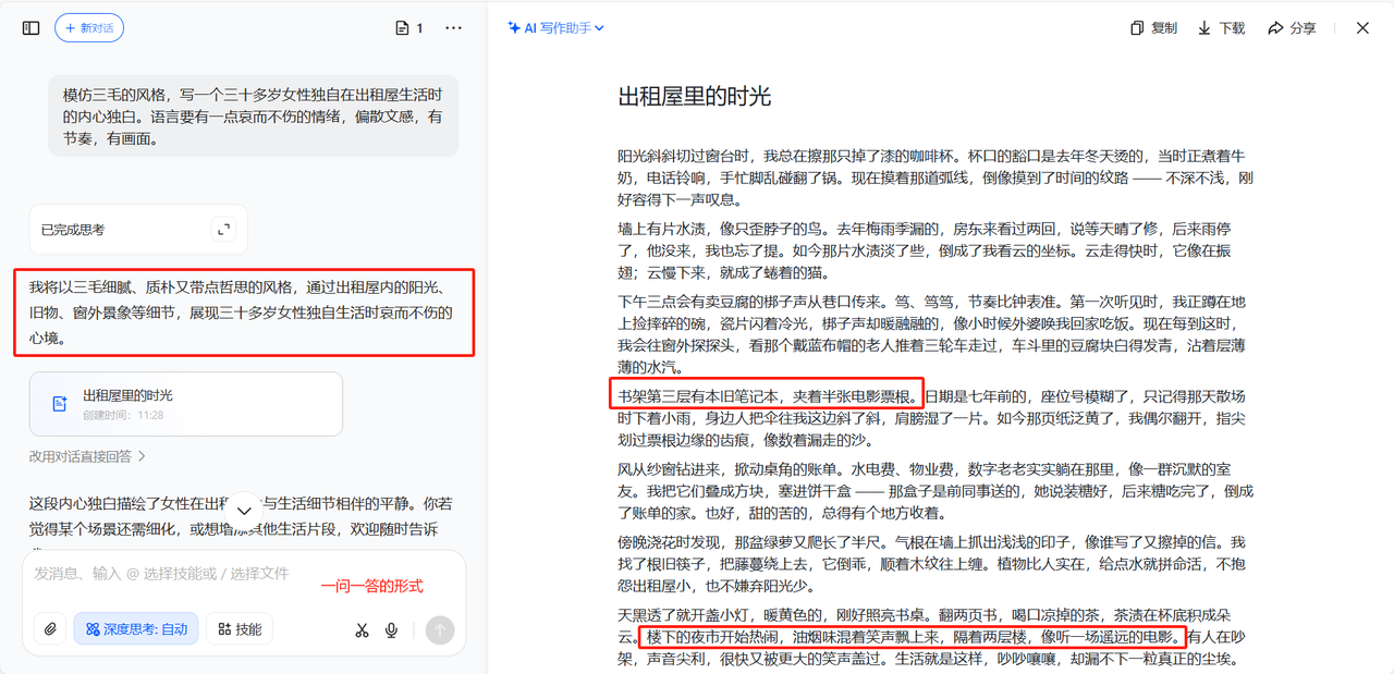 我让它模仿三毛风格写一段人物内心描写,生成的内容有明显的情绪感和节奏感,但问题是生成速度偏慢,而且一问一答的节奏会让人容易中断思路。