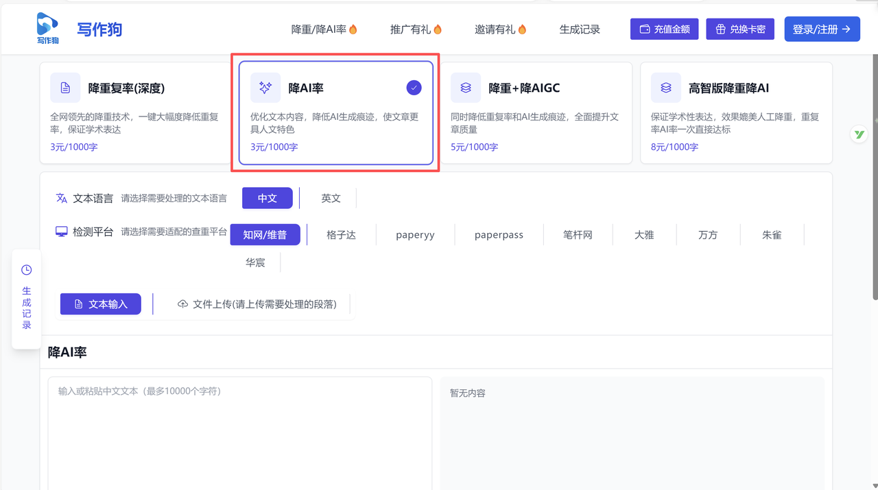 写作狗,你肯定在小红书刷到过,营销做得确实好。价格也很有吸引力,算下来很便宜。从效果上看,它确实能降,能满足基本的降A需求。
