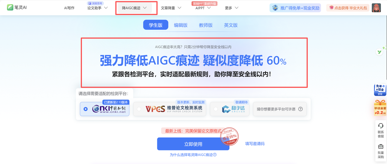 核心优势:降AI效果顶,学术味儿足,格式100%还原
