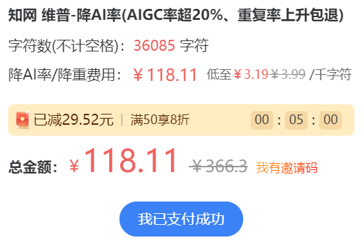 降AI效果还算中规中矩,一般能把AIGC率降低30%-50%左右。但有个问题:它对语句的改写力度比较大,有时候会改变原意,需要人工复查。而且价格偏高,千字5元,万字论文要50+