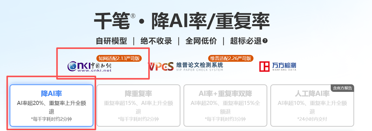 千笔降AI利用智能算法进行文章优化。操作界面也很简洁,并且适配知网最新标准,适合目前毕业季同学使用,但是千笔价格较高,适合字数不多的同学