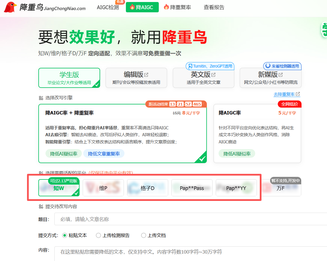 老牌查重平台,这次我体验了它的降AIGC功能,直接查重+论文降AIGC"一站式服务,界面设计也比较专业。可以直接上传检测报告,让它针对性降AI,但有的段落修改后语句衔接不够自然,经常出现"前半句学术腔,后半句大白话"的割裂感,需要自己再润色。