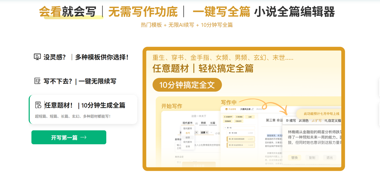 核心功能: 它的 AI写全篇小说 能按模板一键拉出章节,支持站内保存和一键续写,另外有编辑大纲和素材板块。