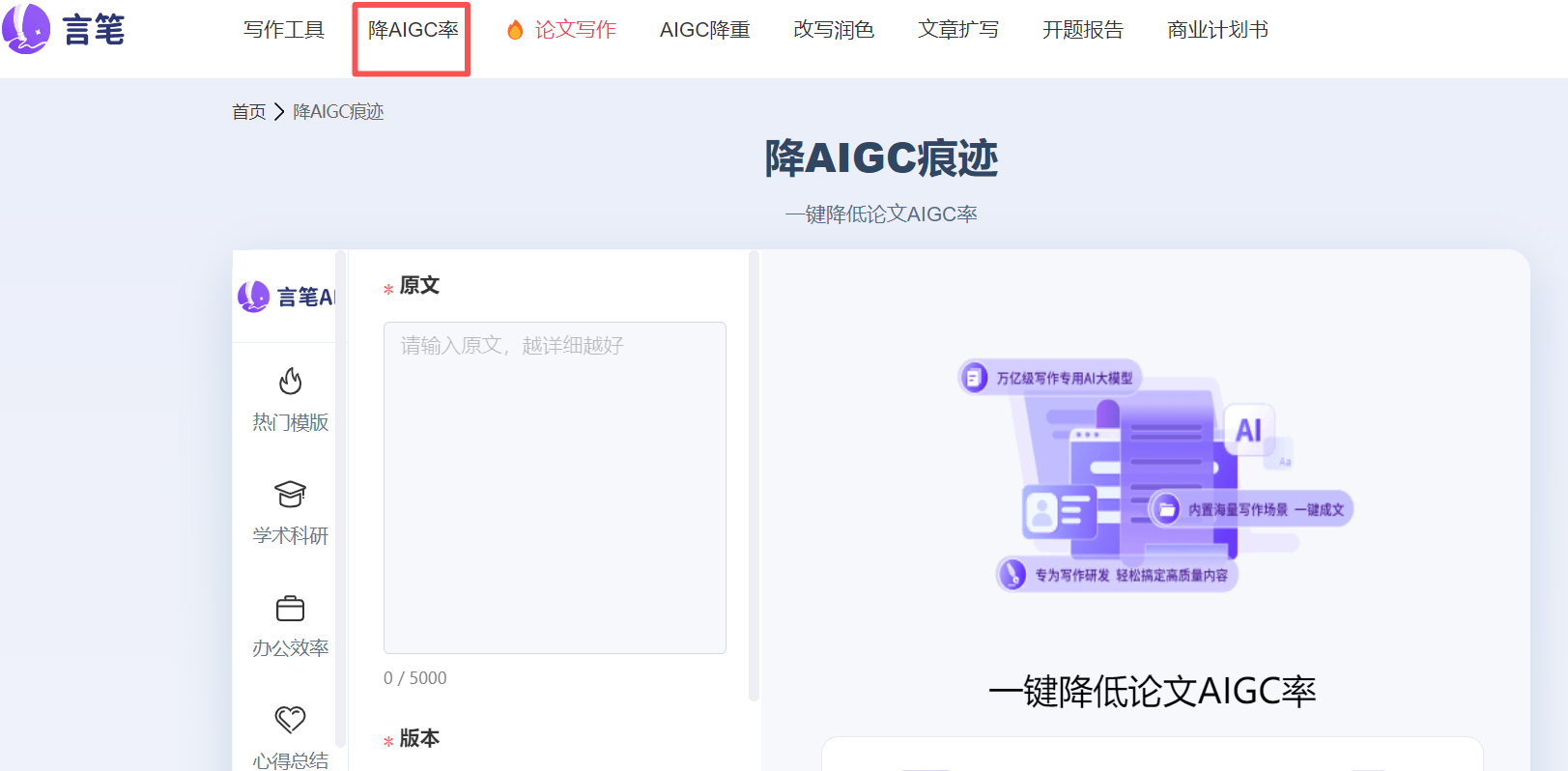 言笔AI是综合性写作平台,可以用来降AI率,不过改完后有点偏口语化,学术味不够浓,需要再润色一下。