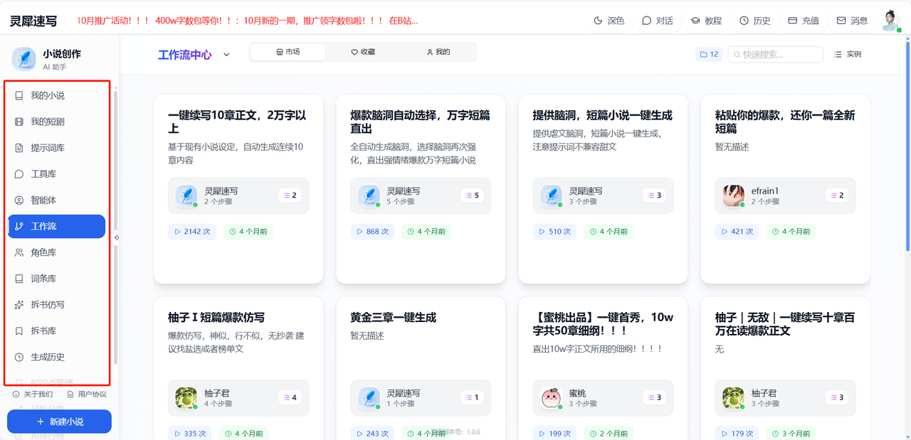 功能特色: 提供从大纲、人设到正文的“一条龙”服务。