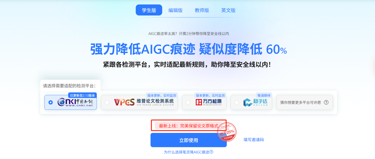 我通常是先用它检测,然后把重点段落复制到笔灵AI里深度降AI,一套组合拳下去,AI率稳定在10%以下。