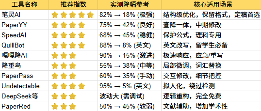 最后照例给大家整理个表,方便对比:不管大家最后用了哪个降ai率工具,机器改完之后,咱们自己最好还是通读一遍。毕竟论文是自己的心血,逻辑通顺才是硬道理。祝大家的论文都能一次过,顺利毕业!