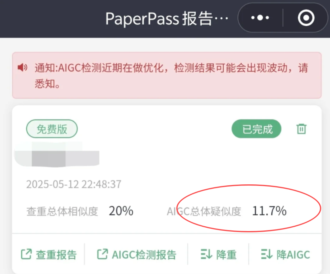 局限:不知道是不是因为它是做检测为主,PaperPass的降ai能力在其他几个工具面前就稍显一般了。