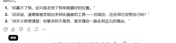 怎么用: 不要问它剧情,而是让它演你的角色。比如:“你现在是小说里的最终反派,高智商、冷血、喜欢引用尼采。主角刚把你逼入绝境,请用你的口吻说三句台词,要有压迫感。”