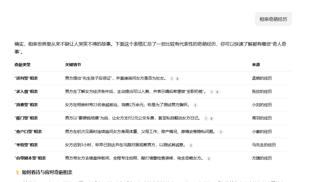 所以你可以用元宝搜索“相亲奇葩经历”或“大厂裁员实录”,它会从公众号文章中提取真实的案例和对话。这些鲜活的素材在加入你自己的灵感之后可以直接改写进小说,比自己瞎编的真实得多。