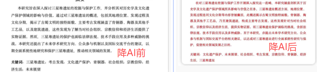 实测感受(含翻车点):它主打一个“人文特色”,改出来的词儿确实比我自己写得文雅,降ai率的时候可以选择只上传标红的那一段,省钱省事。不过我有次改完发现,它把我的核心论点给曲解了,虽然概率不高,但它确实存在修改不到位或者改错的情况。
