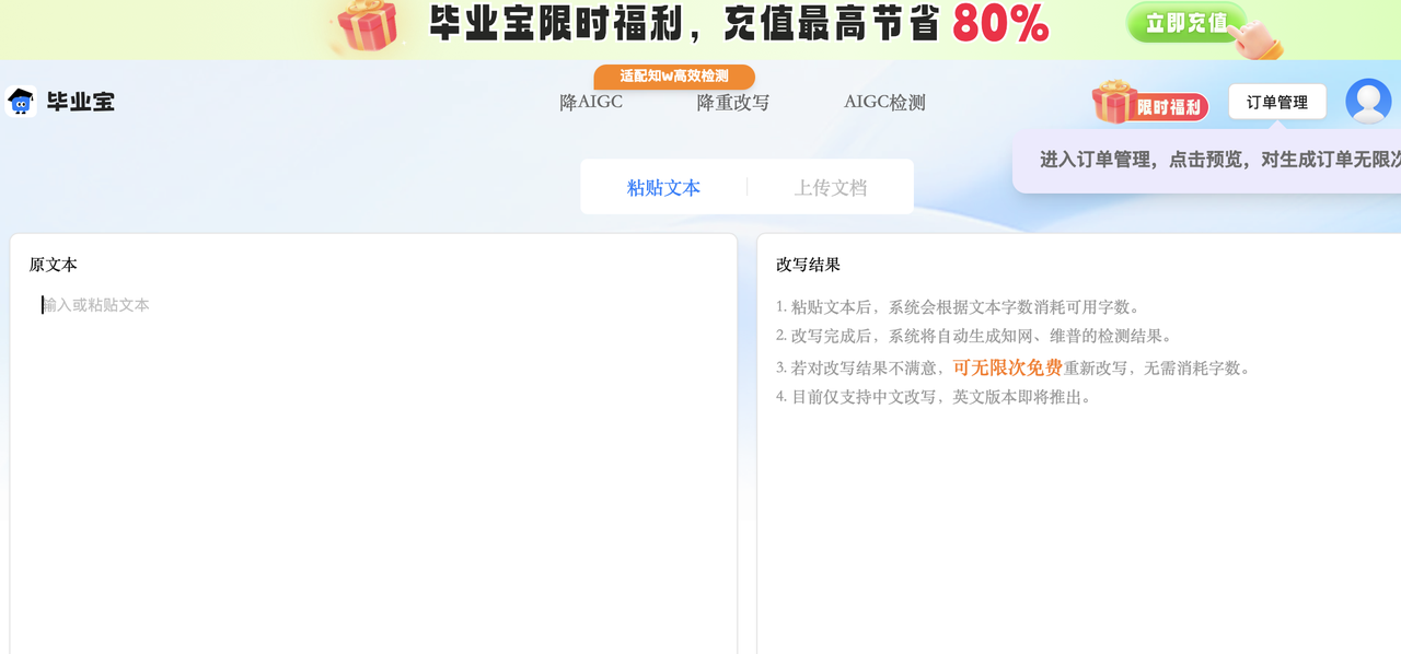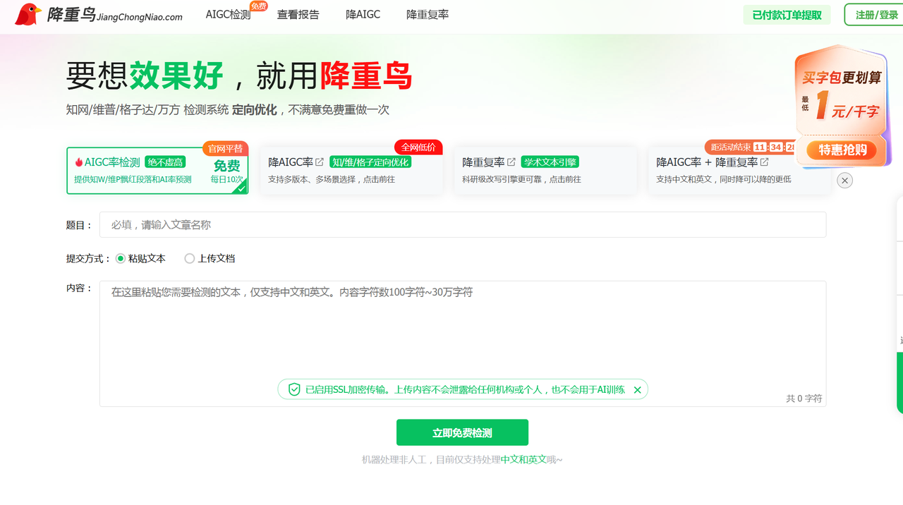 这个平台给我的感觉就是“中规中矩”。它的优势在于功能全,而且确实有 免费降ai率检测 的入口(虽然有限制)。界面操作起来也很顺手,毕竟是老平台了。