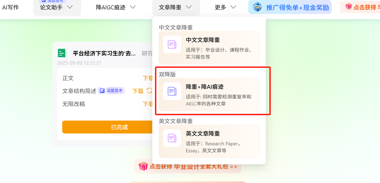 它的界面特别干净,一键上传就能开始。它有个特色是“双降模式”,就是同时处理查重率和 ai降ai 率。速度也很快,几千字的论文一分钟就搞定。