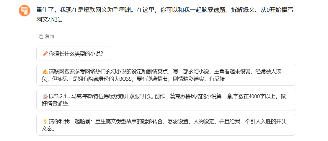 核心优势:极度垂直网文领域,上手快,直接网页就能用,非常适合新手解决“第一章怎么写”的难题。