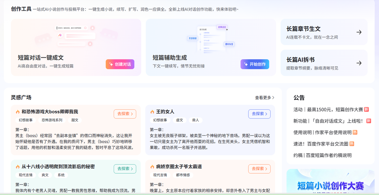 这是百度官方出的工具,最大的优势就是“原生适配”。如果你的目标是百度小说或者百家号的连载,用它生成的ai生成小说内容,风味是非常对口的。