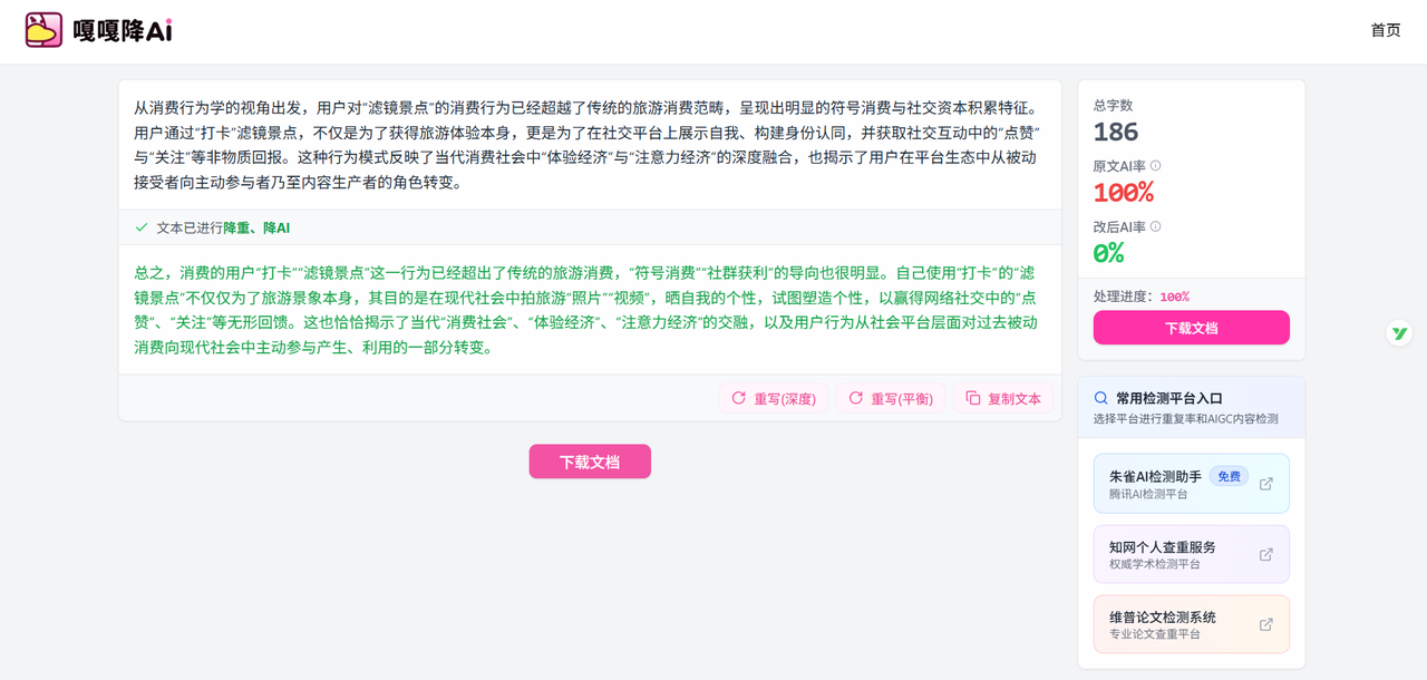 功能简介:它是一个三合一平台,检测、降重、降AI都能搞。
