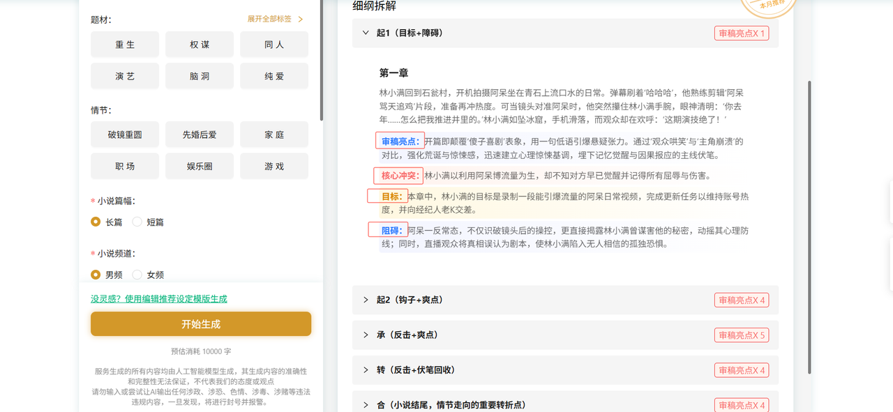 另外,对于新人来说,它的【小说编辑大纲】简直是保姆级的。它能直接生成带有编辑视角的 小说大纲范例超详细 版本,包括核心冲突、审稿亮点,直接解决了新手“写着写着就崩”的痛点。