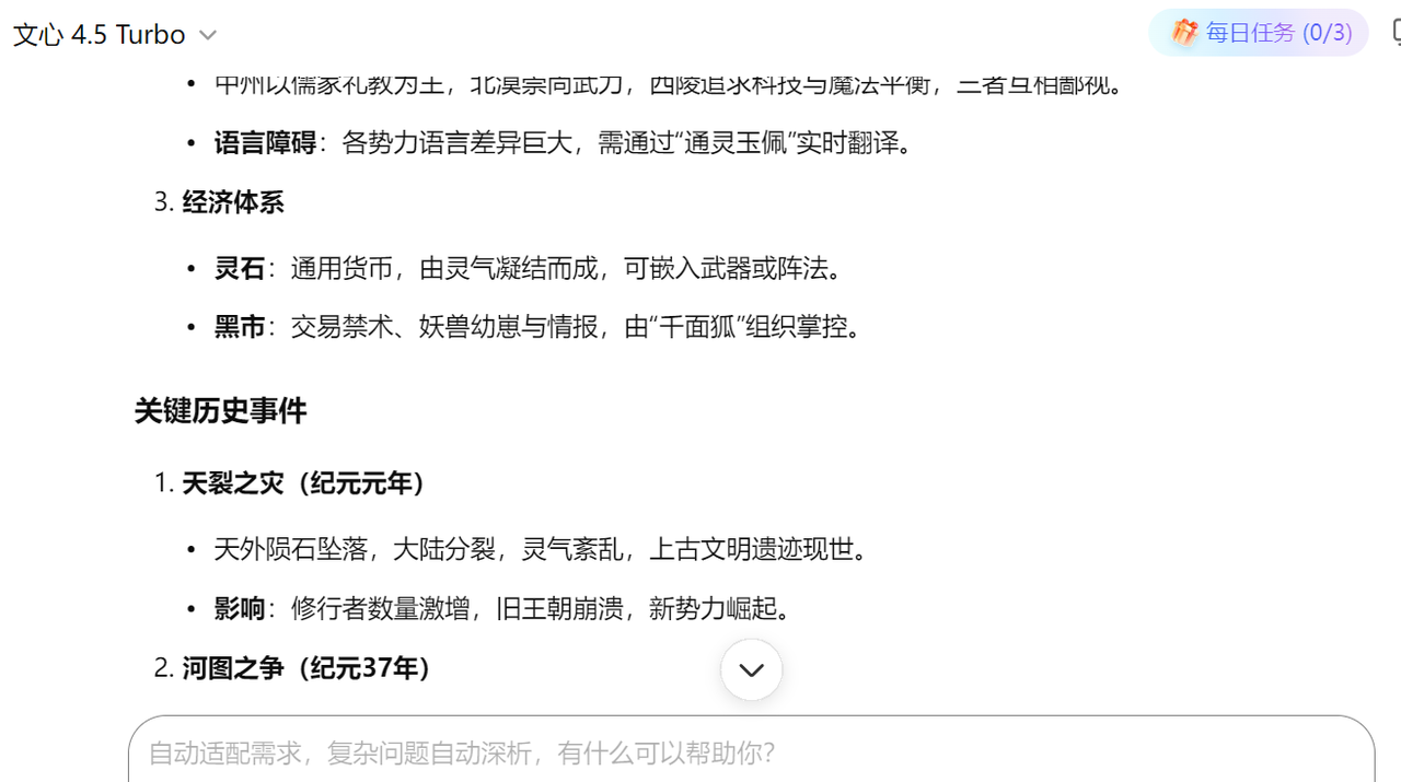 我的实测体验:当我不确定某个朝代的官职名称或者地理环境时,用它来生成背景资料非常靠谱,很少会出现常识性错误。它能帮你构建一个逻辑严谨的世界观基础。