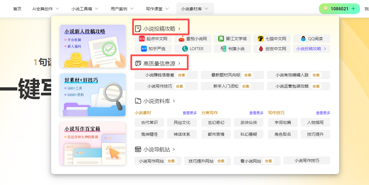 它还有个小说素材库功能,里面有新人投稿攻略、小说赚钱信息差,能解决80%新手会遇到的问题,没事可以点开看看,不用到处搜集信息了