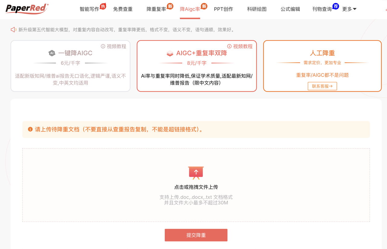 专为中文学术写作定制的去AI化平台,无需繁琐指令,上传文件即可享受类人工改写的效果。其底层逻辑对标知网与维普算法,侧重于句式结构的深层重构,而非简单的同义词替换。