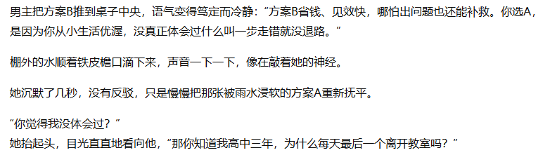 比如我让它生成一段男主对女主产生误会的片段,它生成的内容是这样的: