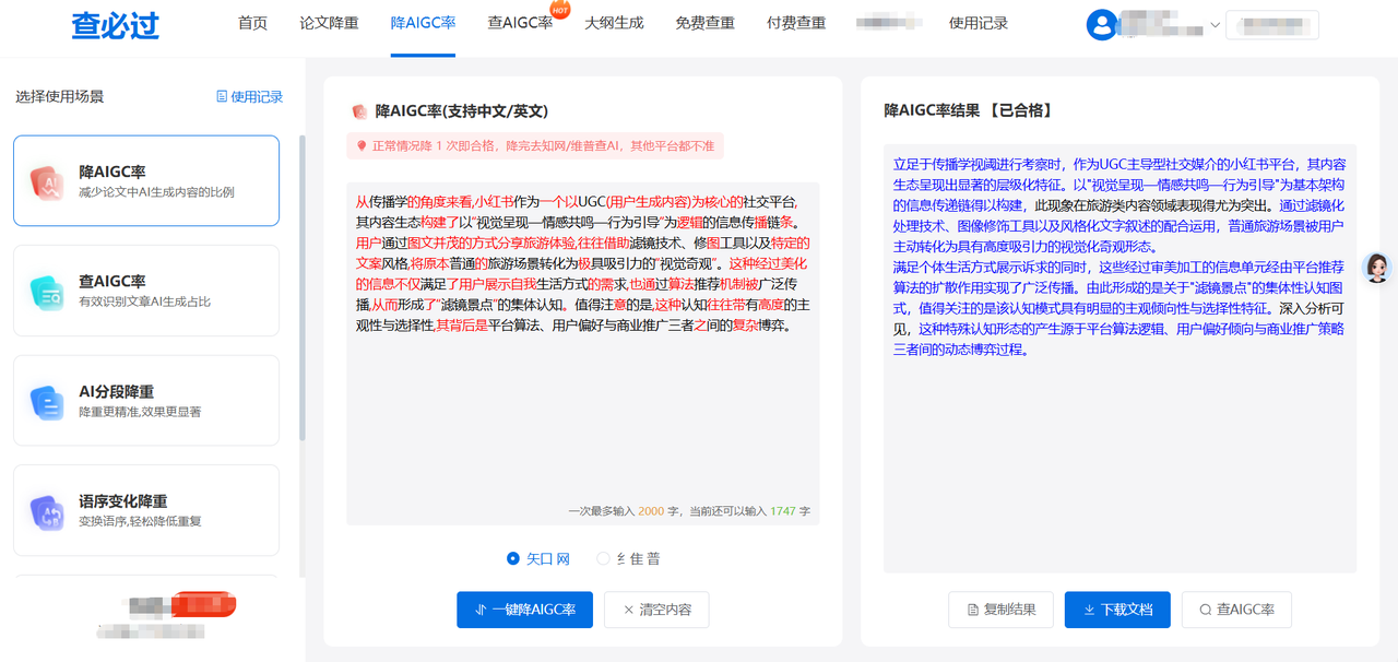 这也是我最终用来定稿的工具。之前我试过一些小工具,改完虽然AI率降了,但读起来甚至不通顺。