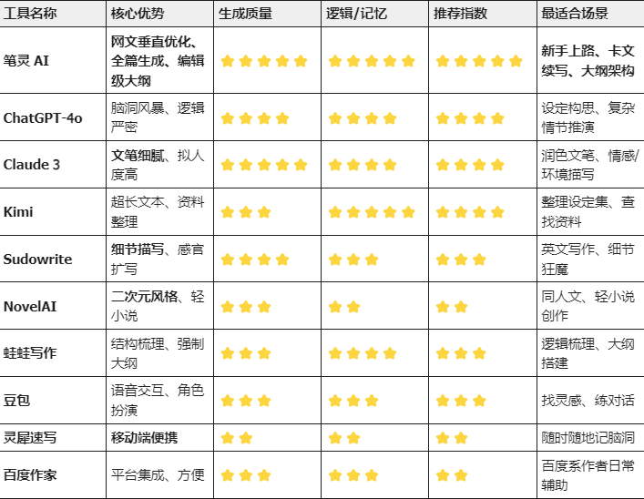 为了帮大家节省时间,我把这 10 款工具做了一个汇总对比表。建议收藏,下次卡文的时候拿出来看看。