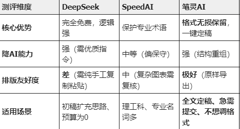 【摘要】本文针对毕业论文AI检测率过高问题,评测了DeepSeek、笔灵AI、SpeedAI三款降AI工具。评测聚焦三大核心指标:降AI效果、格式保留度和语言自然度。测试发现:DeepSeek免费但需人工调教且破坏格式;笔灵AI在格式保留和语义重组方面表现突出;SpeedAI则擅长处理理工科专业术语。建议根据需求选择:初稿阶段可用DeepSeek,理工科推荐SpeedAI,临近截稿首选能完美保留格