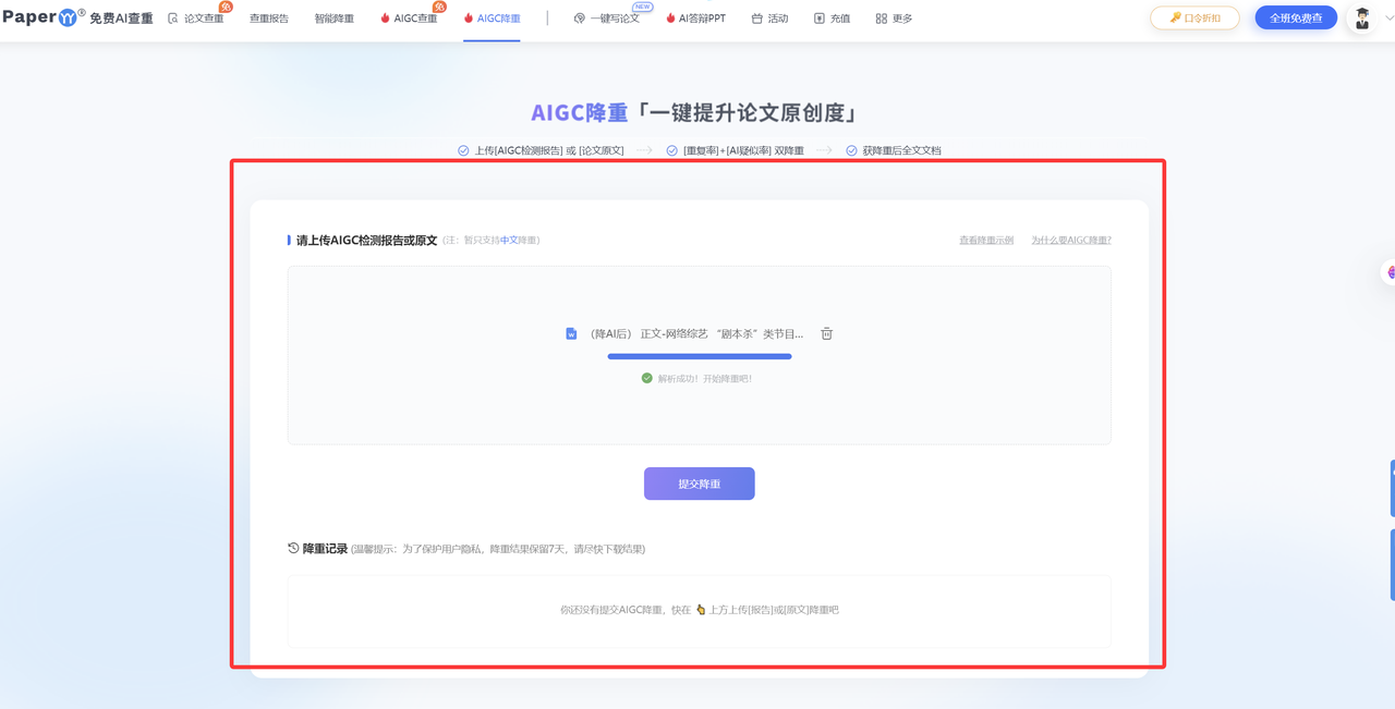 功能入口杂: 界面里功能堆得太多(什么写作、PPT、论文都有),一定要找准降AIGC这个入口,别点错了。