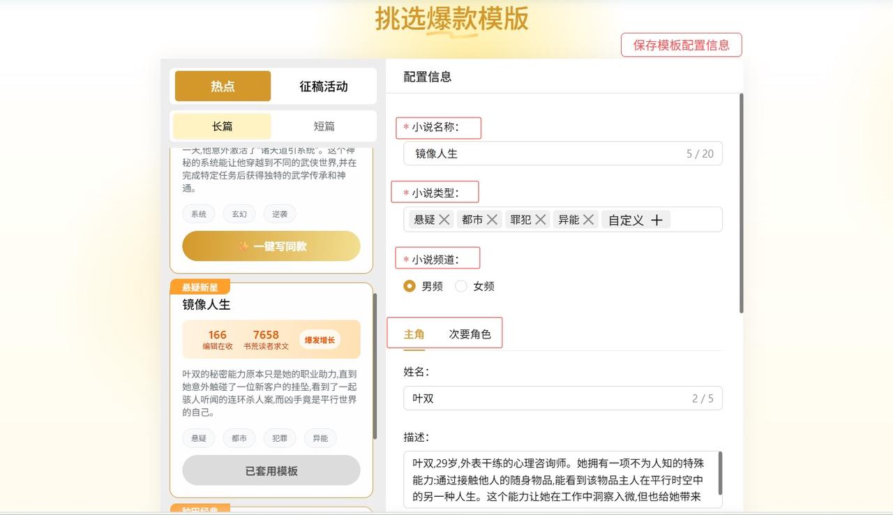 一键写全篇与素材库: 这是它的杀手锏。它内置了大量经过拆解的爆款模板(如重生、系统、豪门等),你只需要填入基本设定,它就能生成非常符合网文节奏的开篇。