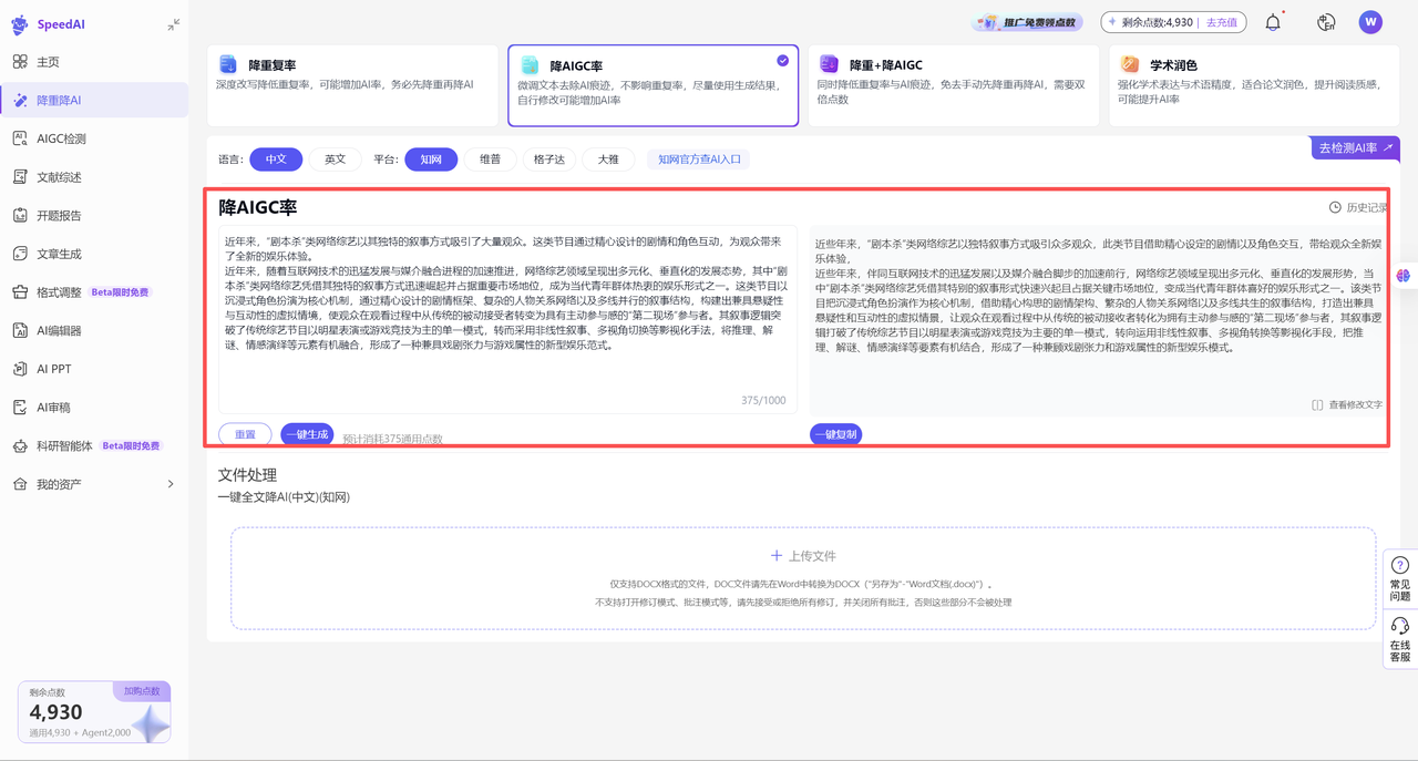 SpeedAI主打的是低价和每日免费额度,对于初稿阶段想大概降一降的同学比较友好。