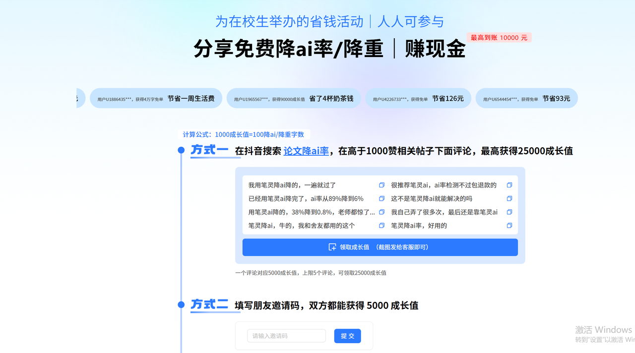 但它不是免费的降AI工具,好在价格对学生党友好,才3元/千字,跟一杯杯奶茶钱差不多。而且现在有通过赚成长值兑换字数的活动 ,对于学生党来说,薅羊毛完全够用了,快喊上室友一起来薅吧!