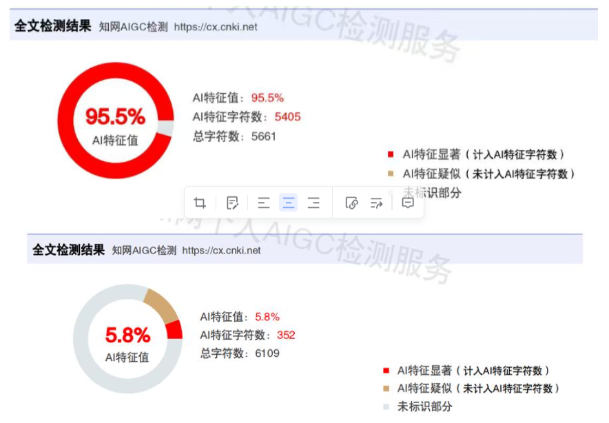 我用一段AI率95.5%的文献综述测试,处理完之后直接降到5.8%,降幅高达90%。不管是本科毕业还是硕士博士,它都能一步到位,稳过安全线。