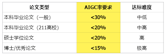 现在各高校对AI率的要求普遍提高了——多数学校要求<30%,部分211高校甚至卡到了<20%。我帮你把不同情况的标准整理成了表格形式,赶紧对照着看看: