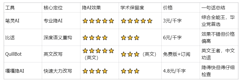 本着“对学弟学妹负责”的原则,我从AIGC规避能力(能否稳定降低主流平台AI检测率)、可读性与语义保留(改完后通不通顺、专业术语有没有丢)、操作便捷性(格式保不保留、上手难不难)、性价比(贵不贵、值不值) 四个维度,给大家好好分析一下各款工具的优劣。