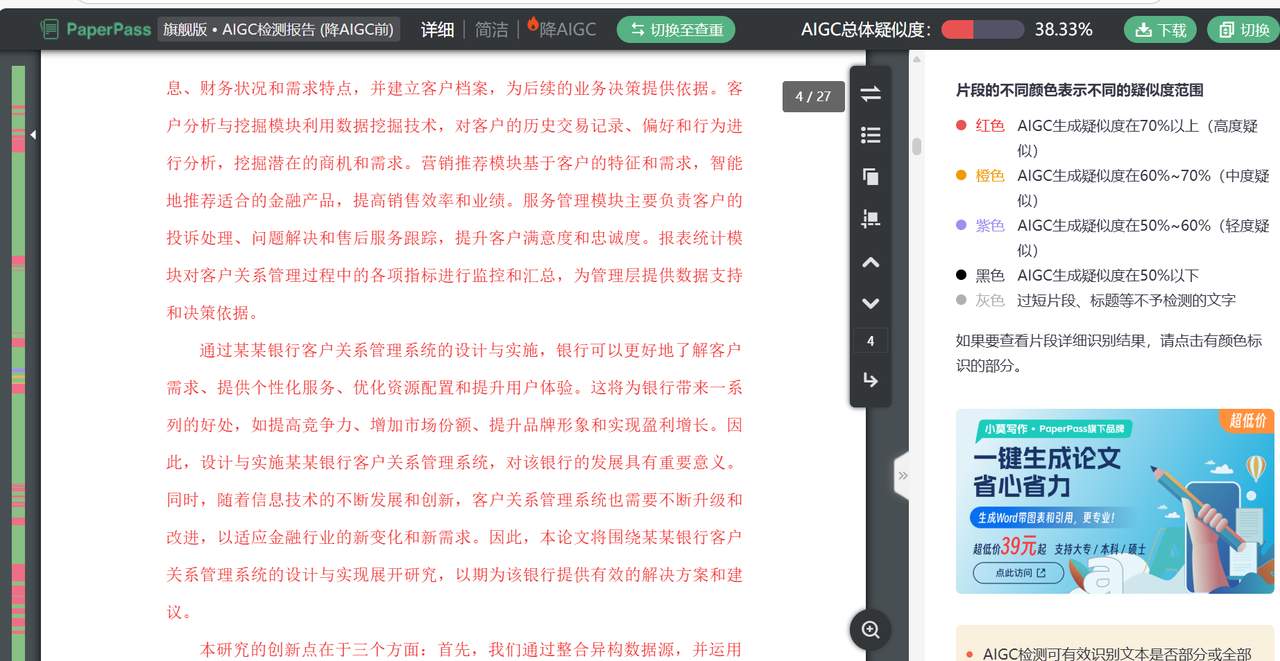 PaperPass的查重报告会给你标出AI疑似片段。它的修改建议更多是基于“降重”逻辑,而不是专门针对AIGC逻辑。