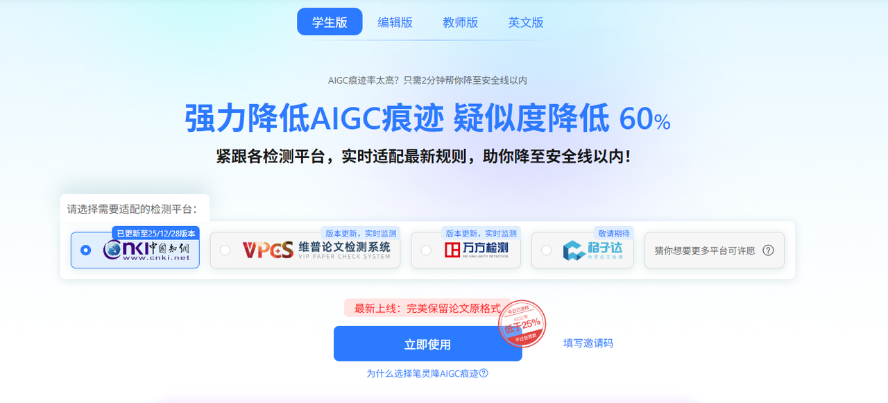 实时更新检测算法,完美适配知网、维普、万方这三大主流平台。