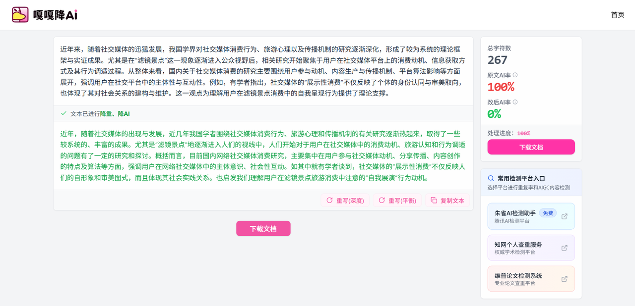 它的降重逻辑属于“结构级优化”。实测下来,原本90%以上的AI率,基本能一次性降到10%以下。而且字数控制得极好,改完字数不会暴增或暴减,变化基本在1000字以内,不用担心超字数。